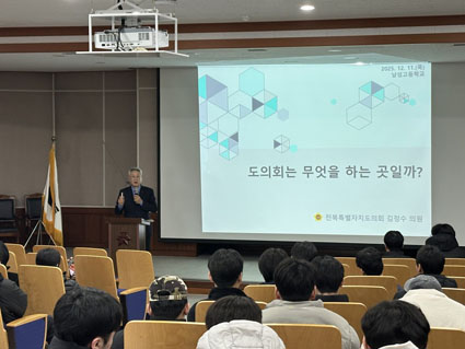 ÀüºÏƯº°ÀÚÄ¡µµÀÇȸ ±èÁ¤¼ö ÀÇ¿ø(ÀÍ»ê2)ÀÌ 11ÀÏ ÀÍ»ê ³²¼º°í¿¡¼ ¼ö´ÉÀ» ¸¶Ä£ 3Çгâ Çлý 270¸íÀ» ´ë»óÀ¸·Î ¡®µµÀÇȸ¿Í µµÀÇ¿øÀÇ ¿ªÇÒ, û¼Ò³âÀÇ Á¤Ä¡ Âü¿©¡¯¸¦ ÁÖÁ¦·Î Ưº° °¿¬¿¡ ³ª¼¹´Ù.
