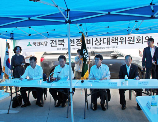±¹¹ÎÀÇ´ç ºñ»ó´ëÃ¥À§¿øµéÀÌ 12ÀÏ ¿ÀÀü ±º»ê½Ã Çö´ëÁß°ø¾÷ Á¶¼±¼Ò ¾Õ ³ë»ó õ¸·¿¡¼ ÇöÀå ȸÀǸ¦ ÁøÇàÇϰí ÀÖ´Ù. À§¿øµéÀº ±º»êÁ¶¼±¼Ò °¡µ¿Áß´Ü¿¡ µû¸¥ Áö¿ª³» ¿ä±¸»çÇ× ¹× ¿©·ÐÀ» ûÃëÇÏ°í ´ëÃ¥À» ³íÀÇÇØ Á¤ºÎ¿¡ Àû±Ø ¹Ý¿µÀ» ¿ä±¸ÇÒ ¹æÄ§ÀÌ´Ù.