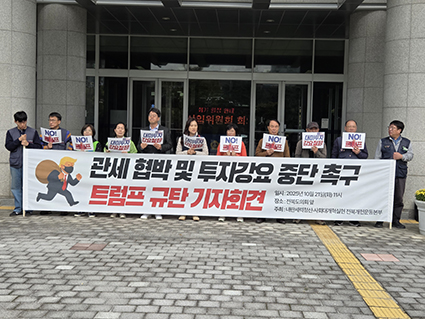 ÀüºÏ°³Çå¿îµ¿º»ºÎ ȸ¿ø 10¿© ¸íÀÌ 21ÀÏ ¿ÀÀü ÀüºÏƯº°ÀÚÄ¡µµÀÇȸ ¾Õ¿¡¼ ±âÀÚȸ°ßÀ» ¿°í, ¡°Æ®·³ÇÁ Àü ¹Ì±¹ ´ëÅë·ÉÀÇ °ü¼¼ Çù¹Ú°ú ´ë¹Ì ÅõÀÚ °¿ä´Â ´ëÇѹα¹ÀÇ Áֱǰú ¹Î»ýÀ» À§ÇùÇÏ´Â ÇàÀ§¡±¶ó¸ç °·ÂÈ÷ ±ÔźÇß´Ù.