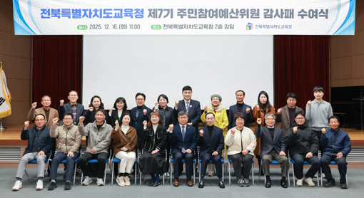 ÀüºÏƯº°ÀÚÄ¡µµ±³À°Ã»ÀÌ ÁÖ¹ÎÂü¿©¿¹»êÀ§¿øÈ¸ À§¿øµéÀÇ ³ë°í¿¡ °¨»ç¸¦ Ç¥Çß´Ù.
