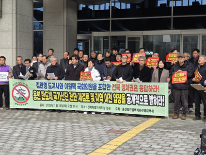 ¼ÛÀüž°Ç¼³¹éÁöÈÀüºÏ´ëÃ¥À§¿øÈ¸(°øµ¿»óÀÓ´ëÇ¥ À̵¿¹é Á¶°æÈñ)´Â ÀüºÏµµÃ» Çö°ü ¾Õ¿¡¼ ±âÀÚȸ°ßÀ» ¿°í, ±è°ü¿µ ÀüºÏƯº°ÀÚÄ¡µµÁö»ç¿Í ÀÌ¿øÅà ±¹È¸ÀÇ¿øÀ» Æ÷ÇÔÇÑ ÀüºÏ Á¤Ä¡±Ç¿¡ ´ëÇØ ¿ëÀÎ ¹ÝµµÃ¼ ±¹°¡»ê´Ü Àü¸é Àç°ËÅä¿Í Áö¿ª Àç¹èÄ¡¿¡ ´ëÇÑ °ø½Ä ÀÔÀåÀ» µµ¹Î ¾Õ¿¡ ¹àÈú °ÍÀ» ¿ä±¸Çß´Ù.