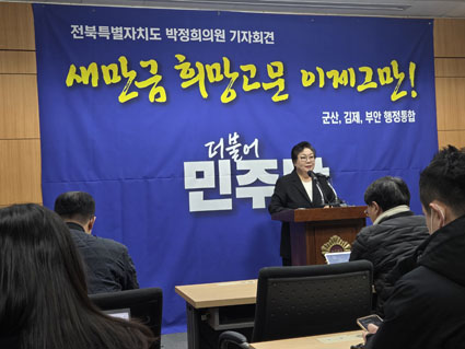 ¹ÚÁ¤Èñ µµÀÇ¿øÀº 20ÀÏ ¿ÀÀü ÀüºÏµµÀÇȸ ºê¸®Çη뿡¼ ±âÀÚȸ°ßÀ» ¿°í ¡°»õ¸¸±Ý °³¹ßÀÌ ¼ö½Ê ³â° Èñ¸Á°í¹®¿¡ ¸Ó¹°·¯ ÀÖ´Ù¡±¸ç ¡°ÀÌÀç¸í Á¤ºÎÀÇ 5±Ø 3Ư ±¹°¡Àü·«°ú Áö¹æºÐ±Ç Á¤Ã¥¿¡ ¼±Á¦ÀûÀ¸·Î ´ëÀÀÇϱâ À§ÇØ ±º»ê¡¤±èÁ¦¡¤ºÎ¾È ÇàÁ¤ÅëÇÕÀ» ÃßÁøÇØ¾ß ÇÑ´Ù¡±°í ¹àÇû´Ù.
