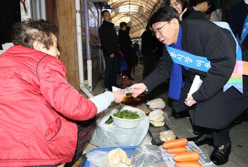 ¿ì¹ü±â ÀüÁÖ½ÃÀåÀÌ 11ÀÏ ÀüÁָ𷡳»½ÃÀåÀ» ¹æ¹®ÇØ Áö¿ª °æÁ¦ Ȱ¼ºÈ¸¦ À§ÇÑ ¼³¸ÂÀÌ ÀüÅë½ÃÀå À庸±â¸¦ Çϰí ÀÖ´Ù.