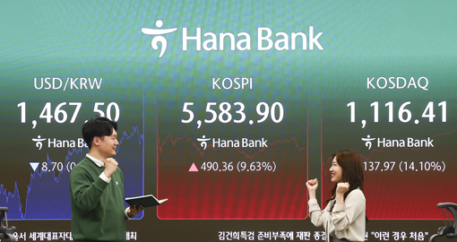 ÄÚ½ºÇÇ´Â Àü °Å·¡ÀÏ(5093.54)º¸´Ù 490.36Æ÷ÀÎÆ®(9.63%) ¿À¸¥ 5583.90¿¡ ¸¶°¨ÇÑ 5ÀÏ ¼¿ï Áß±¸ ÇϳªÀºÇà º»Á¡ Àü±¤ÆÇ¿¡ Áö¼ö°¡ ³ª¿À°í ÀÖ´Ù. ÄÚ½º´Ú Áö¼ö´Â Àü °Å·¡ÀÏ(978.44)º¸´Ù 137.97Æ÷ÀÎÆ®(14.10%) »ó½ÂÇÑ 1116.41¿¡ °Å·¡¸¦ ¸¶ÃÆ´Ù. ¿Üȯ½ÃÀå¿¡¼ ¿ø¡¤´Þ·¯ ȯÀ²Àº Àü °Å·¡ÀÏ(1476.2¿ø)º¸´Ù 8.1¿ø ³»¸° 1468.1¿ø¿¡ ÁÖ°£ °Å·¡¸¦ ¸¶°¨Çß´Ù.