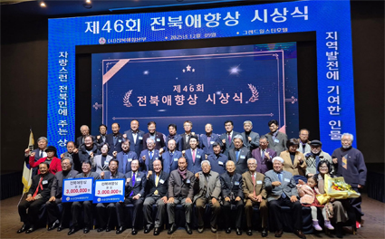 ÀüºÏ¾ÖÇ⺻ºÎ(ÃÑÀç À±¼®Á¤)´Â Áö³ 9ÀÏ ÀüÁÖ ±×·£µå Èú½ºÅÏ µ¥ÀÌÁö½º Ȧ¿¡¼ ¡®Á¦46ȸ ÀüºÏ ¾ÖÇâ ´ë»ó ½Ã»ó½Ä¡¯À» °³ÃÖÇϰí, ¿À·£ ±â°£ °íÇâÀ» À§ÇÑ Çå½Å°ú ºÀ»ç¸¦ À̾î¿Â ¼ö»óÀڵ鿡°Ô Áö¿ª»çȸÀÇ ±íÀº Á¸°æ°ú °¨»çÀÇ ¸¶À½À» ÀüÇß´Ù.