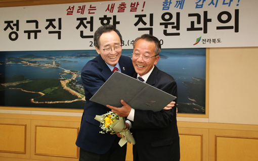 28ÀÏ µµÃ» Á¢°ß½Ç¿¡¼ ¿¸° Á¤±ÔÁ÷ Àüȯ ÀÓ¿ëÀå ±³ºÎÇà»ç¿¡ ¼ÛÇÏÁøµµÁö»ç°¡ Á¤±ÔÁ÷À¸·Î ÀüȯµÈ °ø¹«Á÷¿ø°ú ÇÔ²² ÀÓ¿ëÀåÀ» º¸¸ç ȯÇÑ ¿ôÀ½À» º¸À̰í ÀÖ´Ù. ÀüºÏµµ´Â ±â°£Á¦ ¹× ¿ë¿ª±Ù·ÎÀÚ ÃÑ 207¸íÀÌ Á¤±ÔÁ÷À¸·Î ÀüȯµÇ¾ú´Ù.
