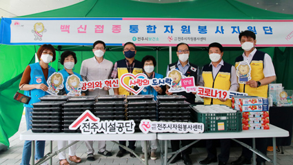 °ø´ÜÀº À̳¯ (»ç)ÀüÁÖ½ÃÀÚ¿øºÀ»ç¼¾ÅÍ(ÀÌ»çÀå ȲÀÇ¿Á)¿Í ÀüºÏ»çȸº¹Áö°øµ¿¸ð±Ýȸ(ȸÀå ±èµ¿¼ö), ÇູÇÑ ¹ä»ó ǪµåºÀ»ç´Ü(ȸÀå ¾È¿µ¼÷)°ú ÇÔ²² ÀüÁֽà ´öÁø±¸¡¤¿Ï»ê±¸¿¡¼ ¿î¿µ ÁßÀÎ Äڷγª19 ¿¹¹æÁ¢Á¾¼¾ÅÍ¿Í ¼±º°Áø·á¼Ò¸¦ ã¾Æ ÀÇ·áÁø µî Á¾»çÀڵ鿡°Ô »ç¶ûÀÇ µµ½Ã¶ô 191°³¸¦ Àü´ÞÇß´Ù.