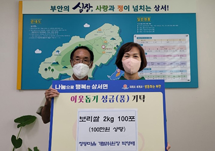 ºÎ¾È »ó¼¸é ûµî¸¶À» °³¹ßÀ§¿øÀå ¹Ú¿µ¹è ¾¾´Â Áö³ 1ÀÏ °ü³» µ¶°Å³ëÀÎ µî ¾î·Á¿î ÀÌ¿ô¿¡°Ô Àü´ÞÇØ ´Þ¶ó¸ç »ó¼¸é»ç¹«¼Ò¿¡ ¼Õ¼ö ³ó»çÁöÀº º¸¸®½Ò 2kg 100Æ÷¸¦ ±âŹÇß´Ù.