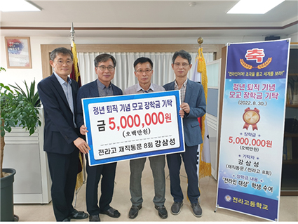 Àü¶ó°íµîÇб³¿¡¼ Á¤³âÅðÁ÷À» ÇÑ °»ï¼º(8ȸ Á¹¾÷) ¼±»ý´ÔÀÌ º»±³¿¡ ÀåÇÐ±Ý 500¸¸¿øÀ» ±âŹÇß´Ù°í 14ÀÏ ¹àÇû´Ù.