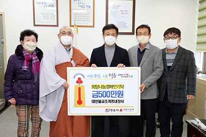 ´ëÇѺұ³Á¶°èÁ¾ ³»Àå»ç(´ëÇ¥ ´ë¿øÁÖÁö½º´Ô)´Â Áö³ 23ÀÏ Á¤À¾½ÃûÀ» ¹æ¹®ÇØ ¾î·Á¿î ÀÌ¿ôÀ» À§ÇØ »ç¿ëÇØ ´Þ¶ó¸ç ¼º±Ý 500¸¸¿øÀ» Àü´ÞÇß´Ù. ¼º±ÝÀº ÀÌ¿ô°ú ÇÔ²² ¸ðµÎ°¡ ÇູÇÑ ¼¼»óÀ» ¸¸µé¾î °¡±â À§ÇØ ³»Àå»ç ½ÅµµµéÀÌ ½Ê½ÃÀÏ¹Ý Á¤¼ºÀ» ¸ð¾Æ ¸¶·ÃÇß´Ù.