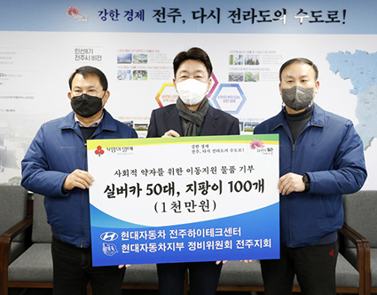 Çö´ëÀÚµ¿Â÷ ÀüÁÖ ÇÏÀÌÅ×Å©¼¾ÅÍ ³ë»ç´Â ¾î·Á¿òÀ» °Þ°í ÀÖ´Â »çȸÀû ¾àÀÚ¸¦ À§ÇØ 1000¸¸ ¿ø »ó´çÀÇ Àå¾ÖÀÎ À̵¿Áö¿ø ¹°Ç°(½Ç¹öÄ« 50´ë, ÁöÆÎÀÌ 100°³)À» ÀüÁֽÿ¡ 27ÀÏ ±âºÎÇß´Ù.