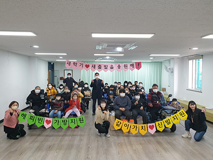 ÀüÁÖÀå¾ÖÀÎÁ¾ÇÕº¹Áö°ü(°üÀå ¹Ú¿ë¹Î)Àº »õÇб⠻õÃâ¹ß ÇÁ·ÎÁ§Æ®·Î Áö¿ª»çȸ ³» Àú¼Òµæ Àå¾ÖÀΰ¡Á¤ ¾Æµ¿ 57¸í¿¡°Ô »õÇб⠼±¹°(°¡¹æ, ½Å¹ß) Àü´Þ½ÄÀ» ÁøÇàÇß´Ù.