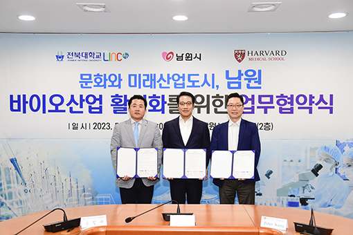 ÀüºÏ´ëÇб³ LINC 3.0 »ç¾÷´Ü(´ÜÀå ¼Ûö±Ô)ÀÌ ³²¿ø½Ã(½ÃÀå ÃÖ°æ½Ä), ÇϹöµåÀÇ´ë ÇÇÅÍ ° ±³¼ö µî°ú Çù¾àÀ» ü°á, ³²¿øÀÇ Ãµ¿¬ ¹ÙÀÌ¿À ¼ÒÀç ¹× ÀÎÇÁ¶ó¸¦ ±â¹ÝÀ¸·Î ÇÑ ±Û·Î¹ú ¿¬±¸¿Í »ç¾÷È¿¡ Çù·ÂÇϱâ·Î Çß´Ù.