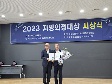 ÇѰæºÀ ±º»ê½ÃÀÇ¿ø(´õºÒ¾î¹ÎÁÖ´ç, ³ª¿î1¡¤2µ¿)ÀÌ Áö³ 24ÀÏ ¼¿ï±Û·Î¹ú¼¾ÅÍ ±¹Á¦È¸ÀÇÀå¿¡¼ ¿¸° 2023 Áö¹æÀÇÁ¤´ë»ó ½Ã»ó½Ä¿¡¼ ÀÔ¹ýȰµ¿ ºÎ¹® Áß ±âÃÊÀÇȸ ´ë»óÀ» ¼ö»óÇß´Ù.