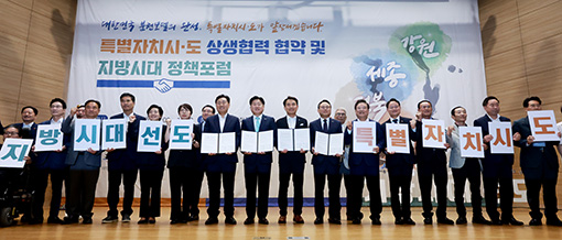 3ÀÏ ±¹È¸ ÀÇ¿øÈ¸°ü ´ëȸÀǽǿ¡¼ ¿¸° 4°³ Ưº°ÀÚÄ¡½Ãµµ »ó»ýÇù·Â Çù¾à ¹× Á¤Ã¥Æ÷·³¿¡ ¿ìµ¿±â ±¹°¡±ÕÇü¹ßÀüÀ§¿øÈ¸ À§¿øÀå, ±è°ü¿µ ÀüºÏµµÁö»ç¸¦ ºñ·ÔÇÑ Á¦ÁÖ¡¤¼¼Á¾¡¤°¿ø 4°³ Ưº°ÀÚÄ¡½Ã¡¤µµÁö»ç, Áö¿ª ±¹È¸ÀÇ¿ø, ½Ã¡¤µµÀÇȸ ÀÇÀå µî 500¿©¸íÀÌ Âü¼®ÇÑ °¡¿îµ¥ Áö¹æ½Ã´ë ¼±µµ¸¦ À§ÇÑ »ó»ýÇù·Â Çù¾à½ÄÀ» °®°í ±â³äÃÔ¿µÀ» Çϰí ÀÖ´Ù.