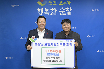 ¼øÃ¢±º ÃâÇâÀεéÀÌ ¿¬ÀÌ¾î °íÇâ»ç¶û±âºÎ±ÝÀ» ±âŹÇÏ¸ç ¼øÃ¢»ç¶û ½Çõ¿¡ ¾ÕÀå¼°í ÀÖ´Â °¡¿îµ¥ ¼øÃ¢±º µ¿°è¸é Ãâ½Å ±â¾÷ÀÎ ±¤Ãµ½Ç¾÷ ±èÁ¾¿Á ´ëÇ¥°¡ 18ÀÏ ¼øÃ¢±º °íÇâ»ç¶û±âºÎ ÃÖ°í¾× ±âºÎÀÚ¿¡ À̸§À» ¿Ã·È´Ù.