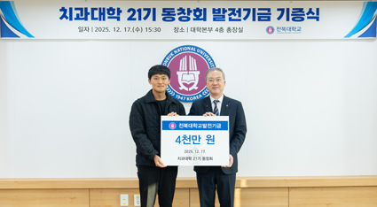 ÀüºÏ´ëÇб³ Ä¡°ú´ëÇÐ 21±â Á¹¾÷»ýµéÀÌ ¸ð±³ÀÇ ¹ßÀü°ú ÈÄÇÐ ¾ç¼ºÀ» ±â¿øÇϸç 4õ¸¸ ¿øÀÇ ¹ßÀü±â±ÝÀ» ±âºÎÇß´Ù. ÀÌ´Â Áö³ 20³â°£ Ä¡°úÀÇ»ç ¶Ç´Â ±³¼ö·Î¼ »çȸ¿¡ À̹ÙÁöÇØ ¿Â Á¹¾÷»ýµéÀÌ ¸ð±³¿¡ °¨»çÀÇ ¸¶À½À» ÀüÇϰíÀÚ ¸¶·ÃµÈ ¶æ±íÀº ±âºÎ´Ù.