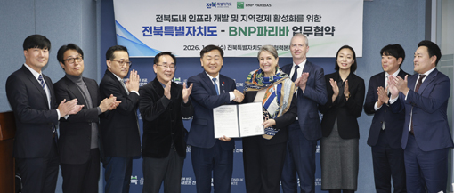 ÀüºÏƯº°ÀÚÄ¡µµ´Â 28ÀÏ ¼¿ï Áß¾ÓÇù·Âº»ºÎ¿¡¼ BNPÆÄ¸®¹Ù¿Í µµ³» ÀÎÇÁ¶ó °³¹ß ¹× Áö¿ª°æÁ¦ Ȱ¼ºÈ¸¦ À§ÇÑ ¾÷¹«Çù¾à(MOU)À» ü°áÇß´Ù. »çÁøÀº ±è°ü¿µ µµÁö»ç¸¦ ºñ·ÔÇÑ BNPÆÄ¸®¹Ù °ü°èÀÚµéÀÌ Çù¾à¼¸¦ µé°í ±â³äÃÔ¿µÀ» Çϰí ÀÖ´Â ¸ð½ÀÀÌ´Ù.