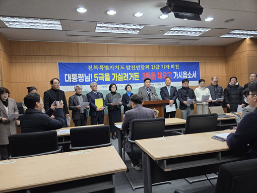 ÀüºÏ¹ßÀü¿¬ÇÕȸ ÃÖÇѾç ȸÀåÀ» ºñ·ÔÇÑ ÀÓ¿øµéÀÌ 12ÀÏ ¿ÀÀü ÀüºÏµµÀÇȸ ºê¸®Çη뿡¼ ±âÀÚȸ°ßÀ» ¿°í, ÀüºÏƯº°ÀÚÄ¡µµ°¡ ¡®3Ư¡¯¿¡ Æ÷ÇÔµÈ Áö 2³âÀÌ Áö³µÁö¸¸ °¡½ÃÀûÀÎ ¼º°ú°¡ ¾ø´Ù¸ç Á¤ºÎ Â÷¿øÀÇ ±¸Ã¼Àû Áö¿øÀ» ¿ä±¸Çß´Ù.