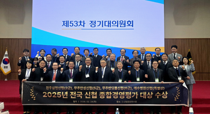 ½ÅÇùÁß¾Óȸ ÀüºÏÁö¿ªº»ºÎ(º»ºÎÀå °¿¬¼ö)´Â ´ëÀü À¯¼º±¸ ¼ÒÀç ½ÅÇùÁß¾Ó¿¬¼ö¿ø¿¡¼ ¿¸° ¡®Á¦53Â÷ ½ÅÇùÁß¾Óȸ Á¤±â´ëÀÇ¿øÈ¸¡¯¿¡¼ ÀüºÏ Áö¿ª 3°³ ½ÅÇùÀÌ 2025³â Àü±¹ ½ÅÇù Á¾Çհ濵Æò°¡¿¡¼ °¢ ±ºº° ´ë»óÀ» ¼ö»óÇß´Ù°í ¹àÇû´Ù.