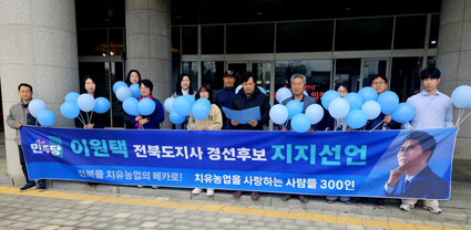 ÀüºÏ Ä¡À¯³ó¾÷Çùȸ(ȸÀå ÀÌÁ¤ÇÏ) ¼Ò¼Ó ÀüºÏ Ä¡À¯³ó¾÷À» »ç¶ûÇÏ´Â »ç¶÷µé°ú ÁöÁöÀÚ 10¿©¸íÀÌ 6ÀÏ ÀüºÏƯº°ÀÚÄ¡µµÀÇȸ ¾Õ¿¡¼ ±âÀÚȸ°ßÀ» ¿°í ´õºÒ¾î¹ÎÁÖ´ç ÀüºÏµµÁö»ç °æ¼±¿¡ ³ª¼± ÀÌ¿øÅà Èĺ¸¿¡ ´ëÇÑ ÁöÁö¸¦ °ø½Ä ¼±¾ðÇß´Ù.