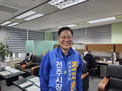 ´õºÒ¾î¹ÎÁÖ´ç ÀüÁÖ½ÃÀå °æ¼±¿¡¼ ÃÖÁ¾ Èĺ¸·Î È®Á¤µÈ Á¶ÁöÈÆ È帰¡ 23ÀÏ ¿ÀÀü ÀüºÏƯº°ÀÚÄ¡µµÀÇȸ ±âÀÚ½ÇÀ» ã¾Æ °æ¼± ½Â¸®¿¡ ´ëÇÑ °¨»ç Àλ縦 ÀüÇϰí, ½ÃÀåÀÌ µÈ´Ù¸é ¾î¶»°Ô ÇÒ °ÍÀÎÁö ½ÃÁ¤ ¿î¿µ ¹æÇâ¿¡ ´ëÇÑ ±¸»óÀ» ¹àÇû´Ù.
