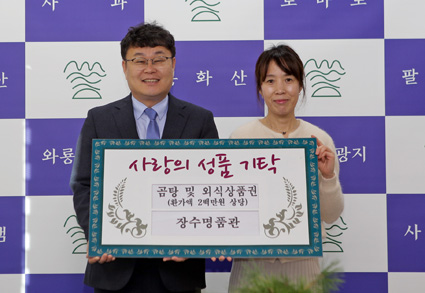 Àå¼ö¸íǰ°ü(´ëÇ¥ ¹Ú¹Ì°æ)Àº 3ÀÏ ¾î·Á¿î ÀÌ¿ôÀ» À§ÇÑ °õÅÁ 100°³¿Í 100¸¸¿ø »ó´ç ¿Ü½Ä»óǰ±ÇÀ» Àå¼ö±º¿¡ ±âŹÇß´Ù.