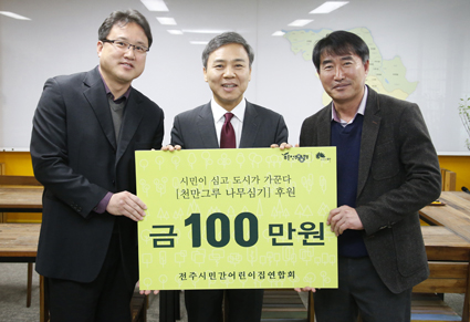 ÀüÁֽà ¹Î°£¾î¸°ÀÌÁý¿¬ÇÕȸ´Â 22ÀÏ ÀüÁÖ½ÃÀå½Ç¿¡¼ ȸ¿ø 10¿©¸íÀÌ Âü¼®ÇÑ °¡¿îµ¥ ¡®Ãµ¸¸±×·ç Á¤¿øµµ½Ã ÀüÁÖ¡¯ ÇÁ·ÎÁ§Æ®ÀÇ ¹ü½Ã¹Î Âü¿© È®»êÀ» À§ÇÑ ½Ã¹Î³ª¹« Çå¼ö ¼º±Ý 100¸¸¿øÀ» Àü´ÞÇß´Ù.