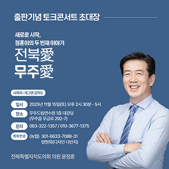 À±Á¤ÈÆ ÀüºÏƯº°ÀÚÄ¡µµÀÇȸ ÀÇ¿ø(¹«ÁÖ)ÀÌ ¹«ÁÖ µå¸²¿¬¼ö¿ø 1Ãþ ´ë°´ç¿¡¼ ¿À´Â 15ÀÏ ¿ÀÈÄ 2½Ã 30ºÐ, ÀÚ½ÅÀÇ µÎ ¹øÂ° À̾߱âÀÎ '»õ·Î¿î ½ÃÀÛ, Á¤ÈÆÀÌÀÇ µÎ ¹øÂ° À̾߱â: ÀüºÏäñ, ¹«ÁÖäñ' ÃâÆÇ±â³äȸ¸¦ °âÇÑ ÅäÅ© ÄܼƮ¸¦ ¿°í µ¶ÀÚµé°ú ¸¸³´Ù.