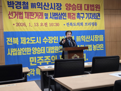 ¹Ú°æÃ¶ Àü ÀÍ»ê½ÃÀåÀÌ 13ÀÏ ¿ÀÀü ÀüºÏƯº°ÀÚÄ¡µµÀÇȸ ºê¸®Çη뿡¼ ±âÀÚȸ°ßÀ» ¿°í, °ú°Å ÀÚ½ÅÀÇ ½ÃÀåÁ÷ »ó½ÇÀÌ ¾ç½ÂÅ ´ë¹ý¿øÀÇ »ç¹ý³ó´Ü°ú Áö¿ª ±¹È¸ÀÇ¿øÀÇ ÀçÆÇ°Å·¡¿¡ ÀÇÇÑ '»ç¹ý»ìÀÎ'À̾ú´Ù°í ÁÖÀåÇϸç Á¤ºÎ¿Í ±¹È¸¿¡ Ưº°°Ë»ç(Ư°Ë) µµÀÔÀ» °·ÂÈ÷ Ã˱¸Çß´Ù.