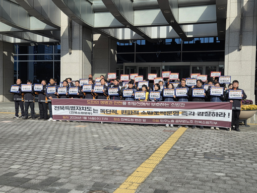 Àü±¹°ø¹«¿ø³ëµ¿Á¶ÇÕ ÀüºÏ¼Ò¹æÁöºÎ ȸ¿ø°ú Àü±¹°ø¹«¿ø³ëµ¿Á¶ÇÕ Àü±¹ ¼Ò¹æÁöºÎ ȸ¿ø µî 50¿© ¸íÀº 14ÀÏ ¿ÀÀü ÀüºÏµµÃ» ¾Õ¿¡¼ ±âÀÚȸ°ßÀ» ÅëÇØ ¡°ÀüºÏ¼Ò¹æº»ºÎÀÇ ÇàÁ¤¡¤ÀÎ»ç ½Ã½ºÅÛÀÌ ¹ý°ú ¿øÄ¢À» ¹þ¾î³ª ¿î¿µµÇ°í ÀÖ´Ù¡±¸ç ¡°ÀÌ·Î ÀÎÇØ Á¶Á÷ÀÇ ½Å·Ú¼º°ú ÇöÀå ´ëÀÀ ¿ª·®ÀÌ ¾àȵǰí ÀÖ´Ù¡±°í ¹àÇû´Ù.