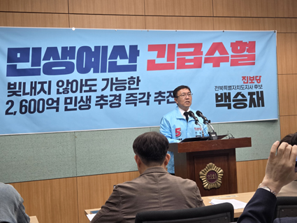 Áøº¸´ç ÀüºÏƯº°ÀÚÄ¡µµÁö»ç Èĺ¸ÀÎ ¹é½ÂÀç È帰¡ 15ÀÏ ÀüºÏƯº°ÀÚÄ¡µµÀÇȸ¿¡¼ ±âÀÚȸ°ßÀ» ¿°í, Áö¹æÃ¤ ¹ßÇà ¾øÀÌ 2,600¾ï¿ø ±Ô¸ðÀÇ ±ä±Þ Ãß°¡°æÁ¤¿¹»ê Æí¼ºÀ» Á¦¾ÈÇϸç ÀüºÏµµÀÇ Àû±ØÀûÀÎ ¹Î»ý ´ëÀÀÀ» Ã˱¸Çß´Ù.